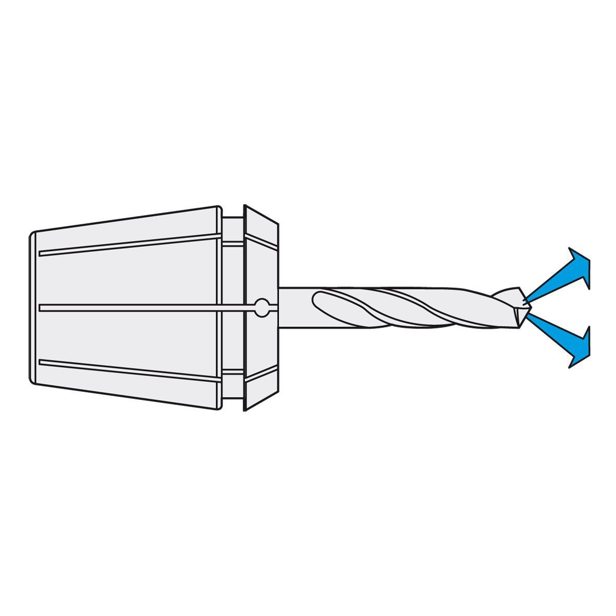 Nur das Nennmaß d kann gespannt werden, mit Dichtstopfen für Innenkühlung (einsetzbar bis 21 bar) Um eine optimale Abdichtung zu erreichen, muss das zu spannende Werkzeug auf der ganzen Länge der geschliffenen Bohrung der Spannzange eingespannt werden.